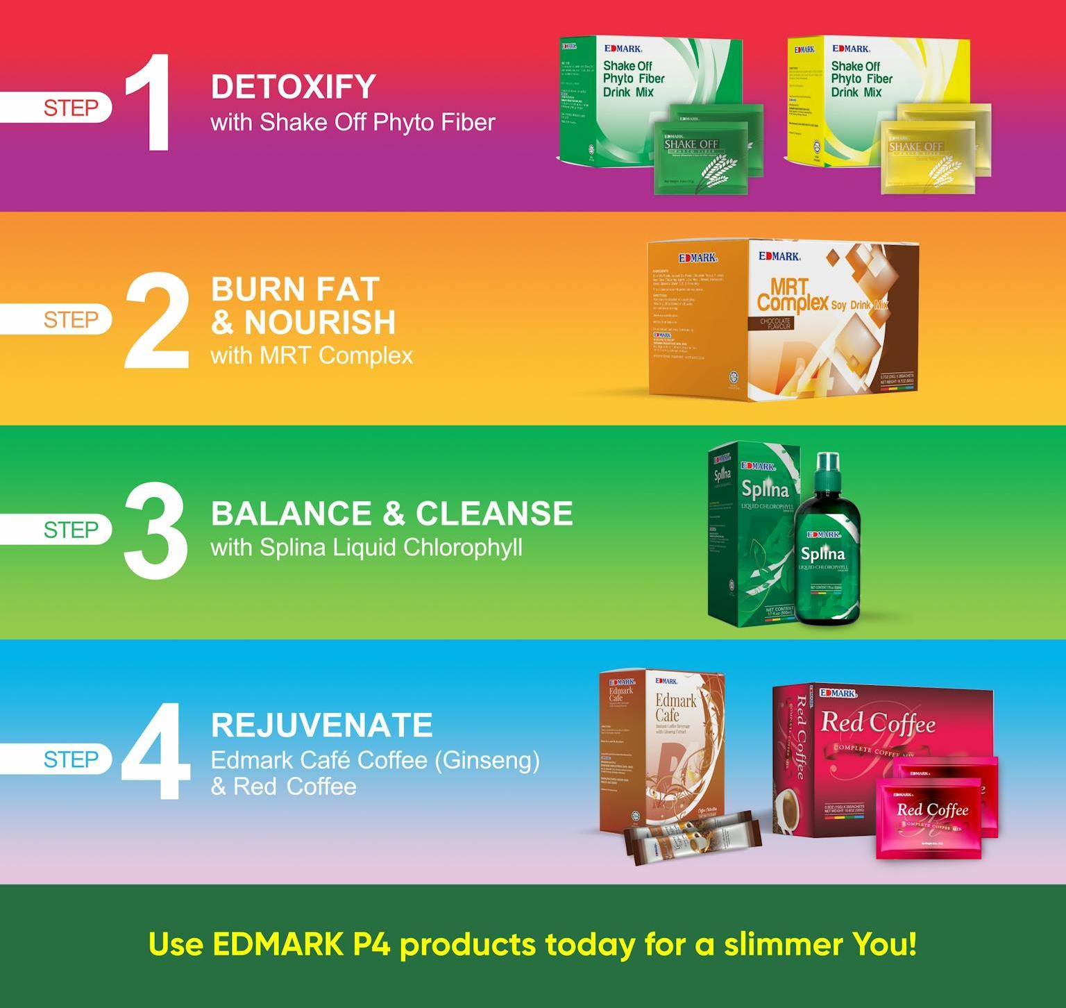 Your Comprehensive Wellness Kit Includes: Shake Off Phyto Fiber (1 box, Lemon / Pandan flavor), MRT Complex (2 boxes, Chocolate flavor), Splina Liquid Chlorophyll (1 bottle, 500ml), EDMARK Ginseng Coffee (1 box), EDMARK Red Coffee (1 box) and Tumbler (1)