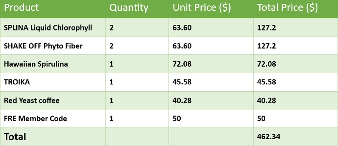 The products in the pack perfectly complement each other. For instance, liquid chlorophyll (SPLINA) and fiber (SHAKE OFF) work together to cleanse your system, while spirulina and TROIKA provide essential nutrients to revitalize and strengthen your body. The Red Yeast Coffee supports cardiovascular health and adds sustainable energy to your routine.